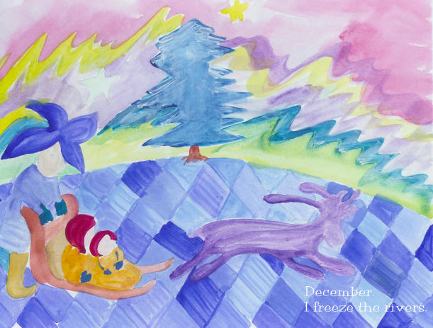 December: I freeze the rivers, but on the safety of the frozen lakes – frozen deeply – the Lapps can drive their reindeer sledges to the Village Churches to celebrate the Festival of Christmas.