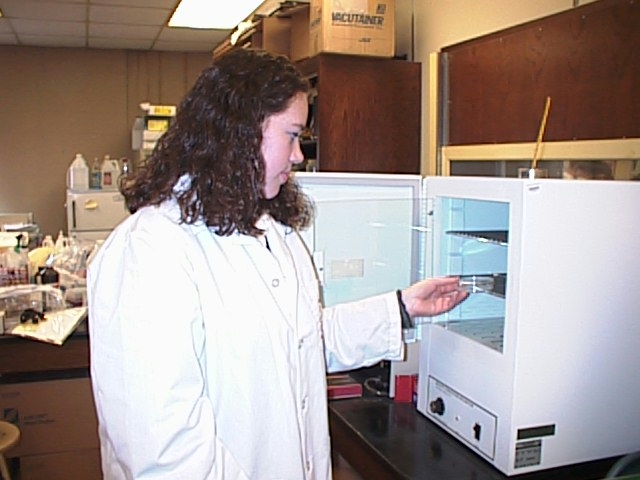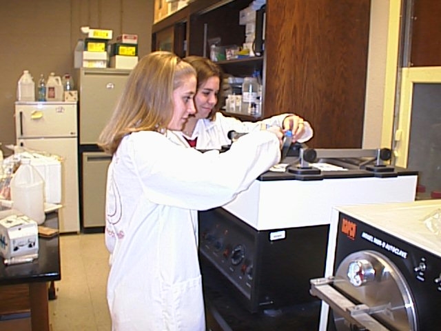 Starlyn Rupinski and Allyson Schulman putting tubes into the shaking waterbath.