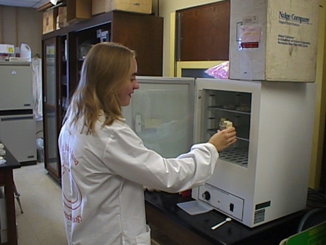 Monica Novotny removes bacteria cultures from the incubator donated by Precision Scientific