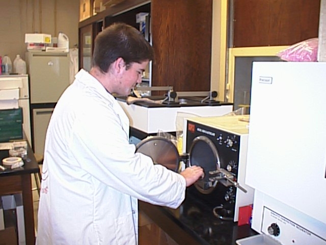 Trevor Joyce removing sterilized items from the autoclave donated by Precision Scientific