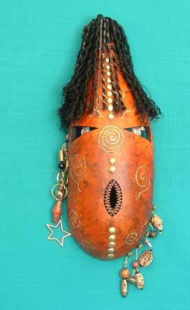The mask was pyro-engraved. Metallic powders were applied with wax. Acrylic paint, metallic embossing powders, brads, glass for eyes, texture medium, leather cording, string, beads and found objects were also used. The back of gourd was painted black.