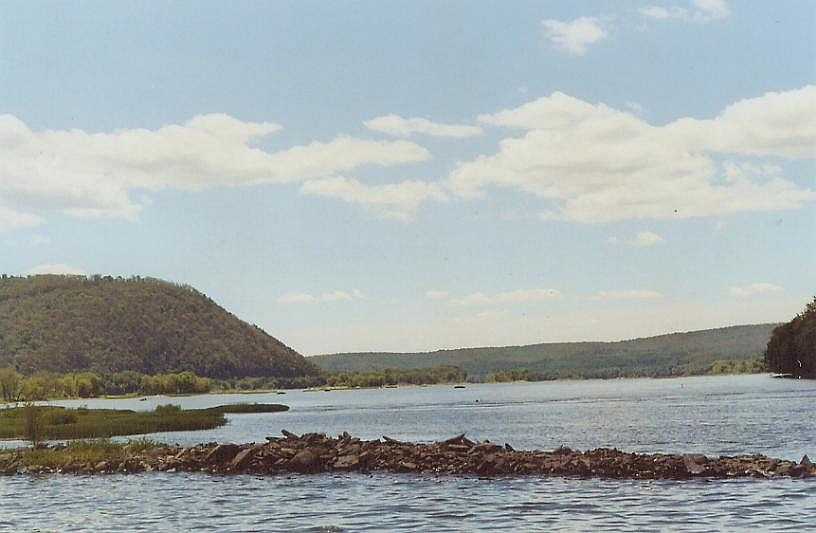 Looking south, the rocks in the foreground are used as a dam to maintain water level for the ferry: