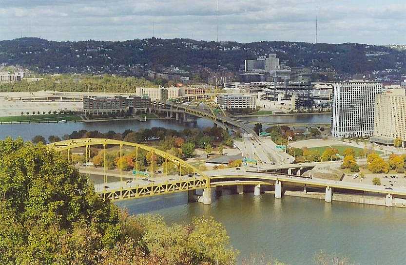 The Fort Pitt Bridge is in the foreground, the Fort Duquesne Bridge is behind: