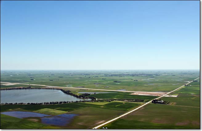 Looking East toward Raccoon river, Sac City to the South, Hwy 20 route visible in fields.