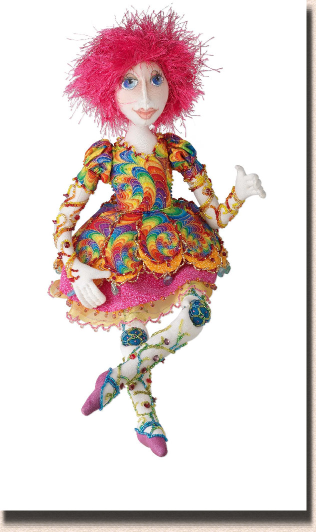 This doll won third place in the Fire Mountain Bead and Gem seed beading Dolls contest catagory in 2008. She was photographed for their ads and was in Soft Dolls and Animals, and Doll Crafter and Costuming.