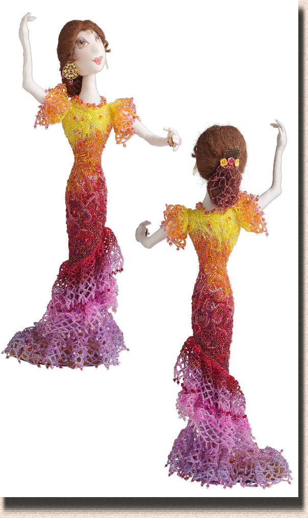 This doll won second place in the Fire Mountain Bead and Gem seed beading Dolls contest catagory in 2009. She is completely hand beaded. Her hair is llama