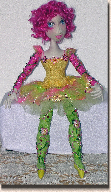 This lovely lady is going to brighten your day. She is 19 inches tall, and is able to sit, bend her knees, and has articulated fingers. Use your brightest scraps for her legs,arms and bodice. Only the hands, face and chest are in muslin or knit flesh tone fabric. The clothing for the doll is a tutu of angelina fiber and net, though you could use anything you want. Feel free to completely bead the bodice and embellish to your hearts content!
