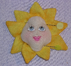 Attach the face to the petal rosette just underneath the face seam. Attach small silk or fabric flowers around the top of the head with a bead in the center.