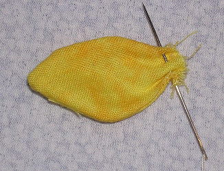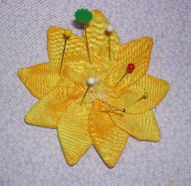 Trace around petal pattern on doubled fabric to make nine petals. Sew on line and leave open at the bottom. Cut out petals, leaving a 1/8 inch seam. Turn right side out. Make two stitches at the bottom of the petal to gather. Place the petals together into a rosette. Sew around the center of the rosette on both sides to secure.