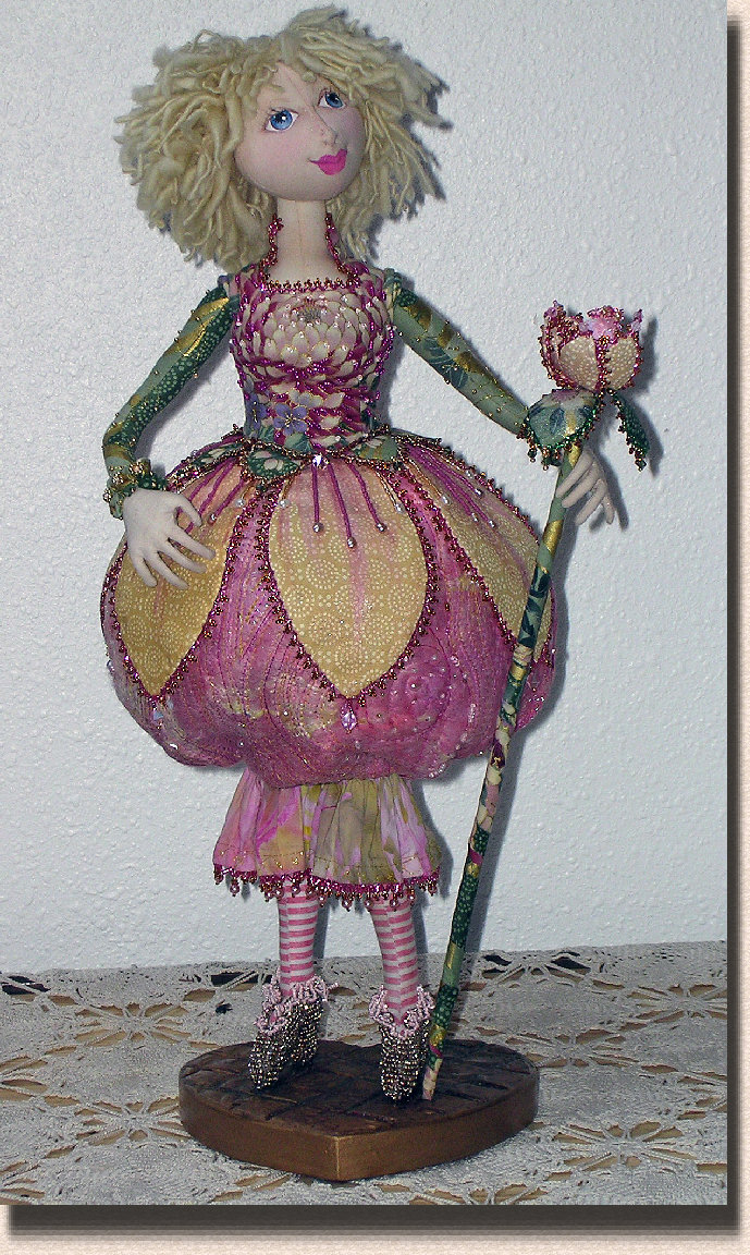 Her shoes are beaded.  The base is wooden with modeling paste carved squares and colored with acrylic paint, and gold wax.  The staff uses a rod covered with the challenge fabric and more beaded petals and leaves.